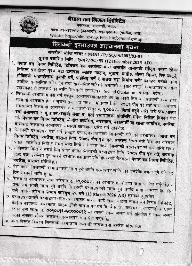सिलबन्दी दरभाउपत्र आह्ववानको सूचना